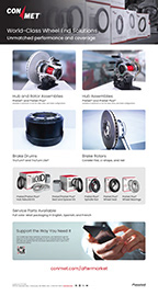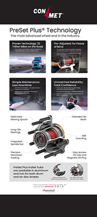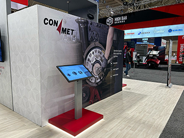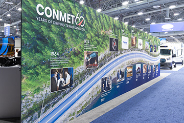 Tradeshow booth graphics for industry trade shows. From left to right, ConMet offers service training for our customers. Middle image is for our 60 year anniversary showing the timeline of milestones in the company. Right, shows the difference of the amount of time it takes to install a ConMet Wheel Hub Assembly versus the competitor using a shop as the theme.